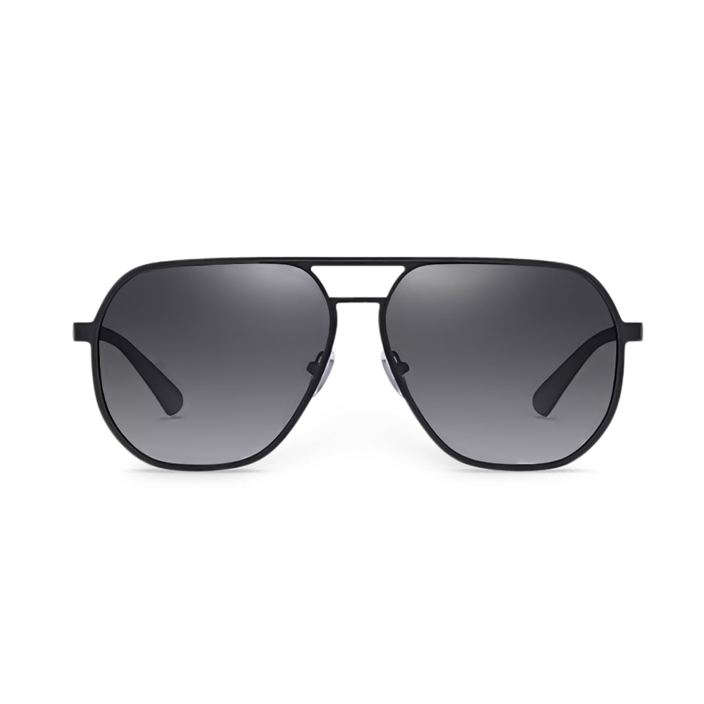 Unisex matte black lightweight double bridge TR90 aviator frames with dark polarised lenses which are 100% UVA & UVB protected. Flexible black arms finish with a red insert on tip.