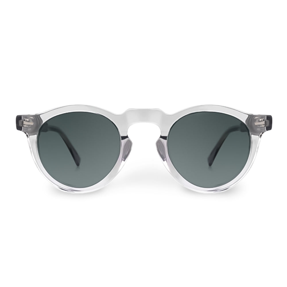 Limited edition high quality Clear Unisex Acetate frames with a high bridge and small metal detail highlight. Lenses are shaded Grey UV400 Polaroid for protection from the suns damaging rays plus being anti-glare Polaroid for outdoor activities.