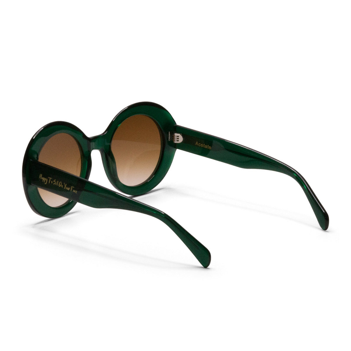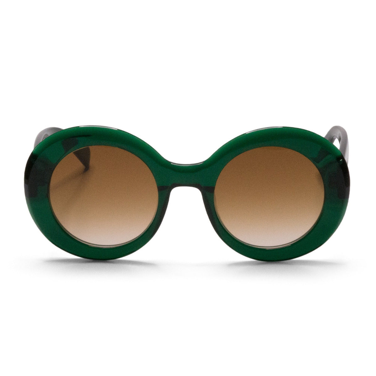 Handcrafted from earth friendly Bio-acetate the round frames, their unique green color and contemporary shape make them a standout accessory for both casual and formal occasions.