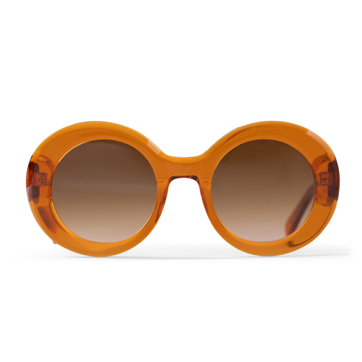 Handcrafted from earth friendly Bio-acetate the round frames, their unique orange color and contemporary shape make them a standout accessory for both casual and formal occasions.