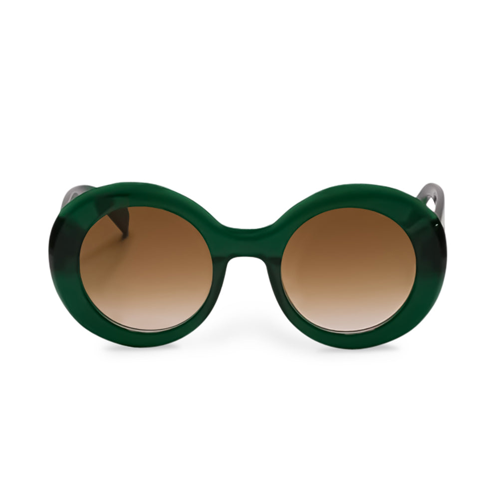Handcrafted from earth friendly Bio-acetate the round frames, their unique green color and contemporary shape make them a standout accessory for both casual and formal occasions.