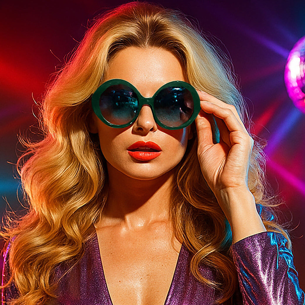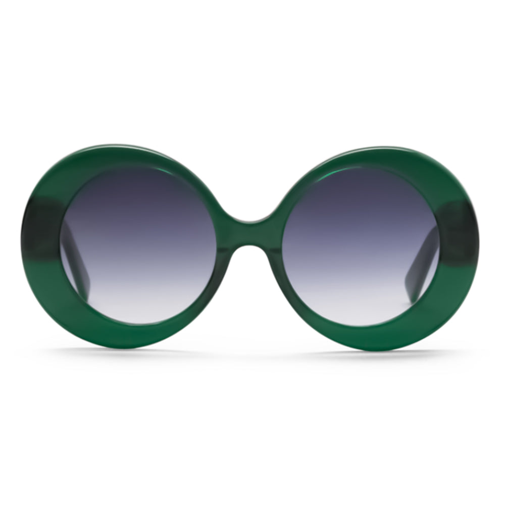 From the crazy NZ team at Happy to Sit on your Face comes Molecule. Green oversized acetate frames with graduating grey lenses. Step into the Studio 54 disco scene, donning outrageous oversized sunglasses and flared bell-bottoms.